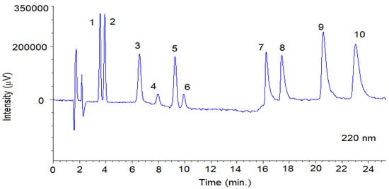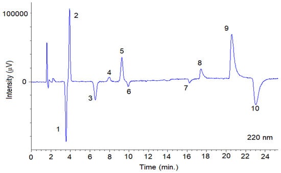 Representative SFC-CD (220 nm) chromatogram obtained from a mixture of the fungicides with optimal chromatographic conditions using Lux® Cellulose-2 column. The SFC conditions are summarized in Section 2.3.1. Peaks 1: TRN-1; 2: TRN-2; 3: TRL-Threo-1; 4: TRL-Erytro-1; 5: TRL-Threo-2; 6: TRL-Erytro-2; 7: BIF-1; 8: BIF-2; 9: SUL-1; 10: SUL-2.