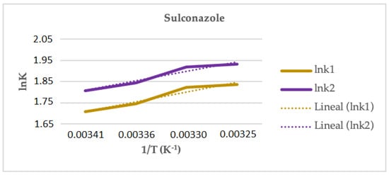 Representation of ln k versus 1/T (Equation (4)) for sulconazole in Lux® Cellulose-2 column and 30% of ethanol.