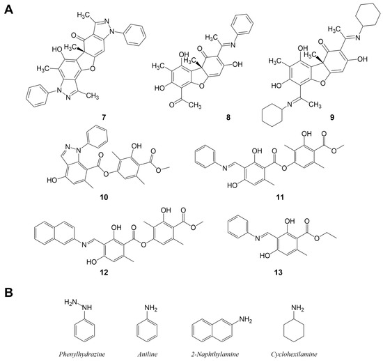Two lichen substances were selected as starting materials given their fast derivatization from the lichens under study. They are common compounds in lichens: usnic acid (2) was used to obtain compounds 7, 8, and 9, and atranorin (1) was used to obtain compounds 10, 11, 12, and 13 (Figure 2A). The condensation of usnic acid (2) with various nitrogen-containing compounds has been described previously under conventional heating with aromatic and aliphatic amines and phenylhydrazines [11,33,34,35,36,37] and atranorin (1), which were condensed using hydrazides under conventional heating [38]. The nitrogen-based reagents that were used in this study were pheynylhydrazine, aniline, 2-naphtilamine, and cyclohexylamine (Figure 2B). Preliminary experiments with aliphatic amines have shown complex reaction mixtures, possibly related to degradation; therefore, we focused our study on cyclic and aromatic compounds. An additional advantage was that the adducts with cyclic amines were much easier to isolate and purify via crystallization.
