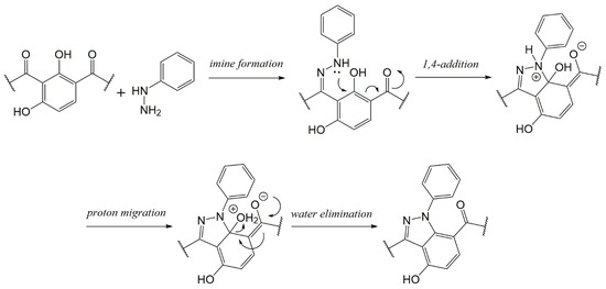 The condensation of 1 with phenylhydrazine yielded compound 10 (86.2%). The reaction provided similar results to 7, forming a pyrazoline ring, but with regioselectivity in this case. To explain this regioselectivity, a reaction mechanism is proposed in Figure 3 in which an aromatic nucleophilic substitution of the hydroxyl group from the phenol by the nitrogen of the coupled hydrazine is facilitated by a 1,4 addition to a vicinal α,β-unsaturated carbonyl group. It has been reported that the addition of hydrazines to 1 under conventional heating provides intermediate imines [38]. Therefore, the formation of the pyrazoline ring in product 10 may indicate that only MW irradiation can provide the necessary energy to complete the reaction. Compound 11 was obtained via the condensation of 1 with aniline. Unlike the other products, there is no information about this reaction. The result shows that MW heating provides a high yield (88.5%) in a short reaction time (3 min). The same result was observed when the reaction was repeated with 2-naphtilamine to obtain compound 12, for which the yield and reaction time were also higher (87.9%, 5 min).