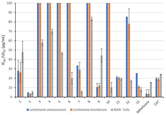 Promastigotes of Leishmania-Leishmania: L. amazonensis, clone 1, NHOM-BR-76-LTB-012 (Lma), Leishmania-Viannia: L. braziliensis, M2904 C192 RJA (M2904). Strains were cultured in Schneider’s insect medium (pH 6.2) supplemented with 10% fetal bovine serum (FBS) and incubated in 96-microwell plates at 26 °C. The biological assay was performed as described elsewhere [25]. Briefly, promastigotes in the logarithmic growth phase at a concentration of 3 × 106 parasites/mL were treated with samples dissolved in DMSO (1%) at different concentrations (3.1–100 μg/mL). Miltefosine (3.1–100 μg/mL, Profounda Company, Orlando, FL, USA) and total alkaloid extracts from Galipea longiflora (CAT, 3.1–100 μg/mL) [26] were used as control drugs. The total alkaloid extract, referred to as CAT y/o AEE, was used as a positive natural extract control for Leishmania and other protozoa parasites as quoted from different authors [27]. The main component of the G. longiflora of the active fraction was 2-phenyl-quinoline, but the bulk total alkaloids are cited as an active natural reference since the values of other synthetic drugs are active at very low concentrations when compared with raw extracts. The leishmanicidal model used was based on promastigotes, and activity values were quoted against cytotoxicity against RAW cells, indicating whether these substances present some selective activity. The microwell plates were incubated at 26 °C for 72 h, the optical density of each well was determined, and the IC50 values were calculated. The assays were performed in triplicate.