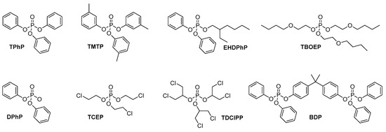 - Van Der Veen, I.; De Boer, J. Phosphorus flame retardants: Properties, production, environmental occurrence, toxicity and analysis. Chemosphere 2012, 88, 1119–1153. [Google Scholar] [CrossRef]