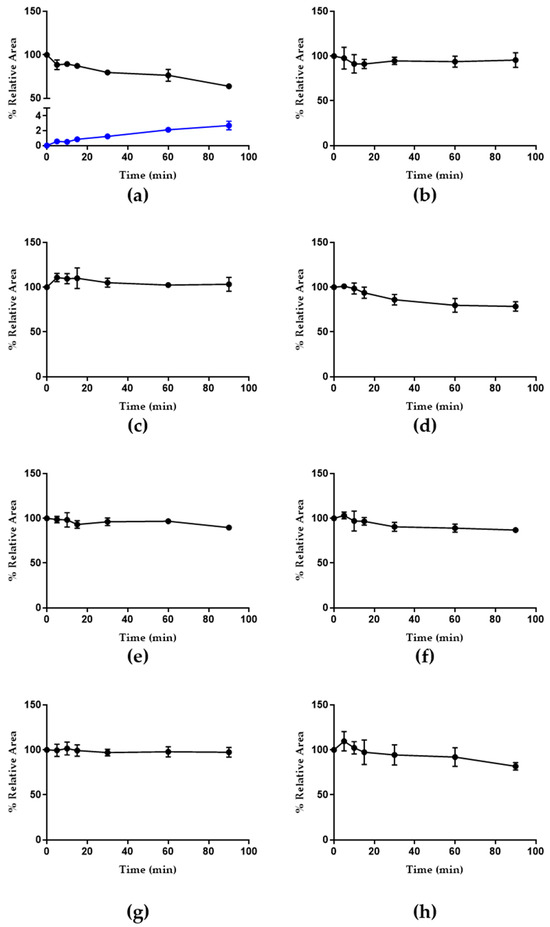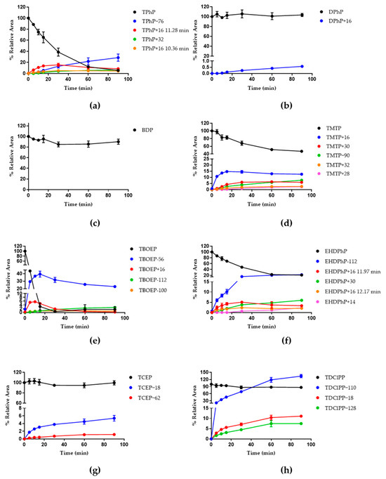 For TCEP incubation, the same metabolites (TCEP−18 and TCEP−62) formed in HLM were also observed upon incubation in HuHep (Figure 2g and Figure 4g, respectively). In HuHep, a higher relative peak area for these metabolites was detected, and phase II metabolites were not observed (Supplementary Materials Table S7). These results are in agreement with Van den Eede et al. data [29], where the formation of phase II metabolites was similarly not observed. TDClPP incubation provides the disappearance of 25% of the substrate at 240 min of incubation time with the formation of the same phase I metabolites already observed upon HLM incubation (Figure 4h). No phase II metabolites were detected either in the positive or negative mode (Supplementary Materials Table S8).