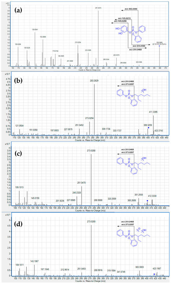 MS/MS spectra of metabolites TPhP+32 (a), EHDPhP+16 at R.T. 11.97 min (b), EDPhP+16 at R.T. 12.17 min (c) and EHDPhP+30 (d) With characteristic fragments.