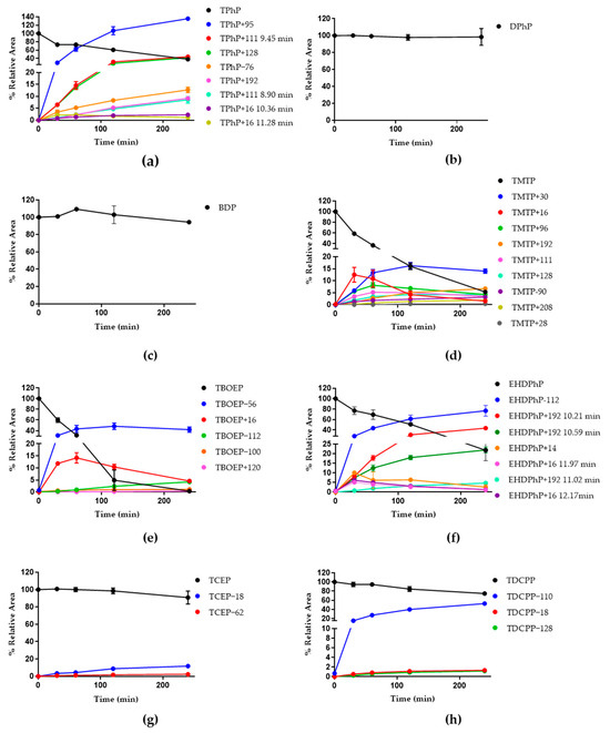 Metabolic profile in HLM for the eight substrates: TPhP (a), DPhP (b), BDP (c), TMTP (d), TBOEP (e), EHDPhP (f), TCEP (g) and TDClPP (h). The observed behavior for substrate degradation is shown in black. The curves for metabolites are colored based on their maximum peak area value with the following order: blue > red > green > orange > pink > light blue > purple > yellow >grey.