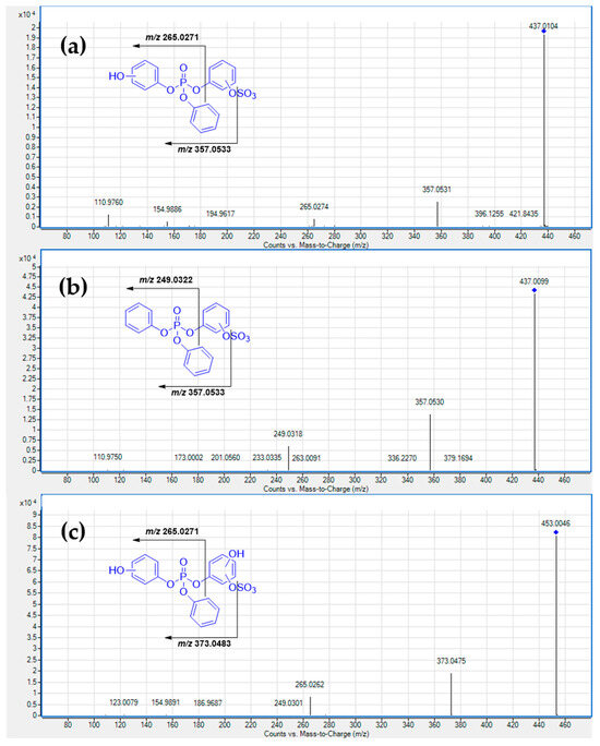 MS/MS spectra acquired in the negative mode and associated with the peaks identified as TPhP+111 at R.T. 8.90 and 9.45 min (Figure 5a,b, respectively) indicated that the dihydroxylation occurs on the same phenyl ring for the metabolite at 9.45 min and on two different phenyl rings for the metabolite at 8.90 min. Informative fragments were m/z 249.0318 or 265.0262. The fragment at m/z 249.0318 is also present in MS/MS spectra of metabolite TPhP+128 (Figure 5c), indicating the presence of two hydroxyl groups on a phenyl ring and the third hydroxylation is on another phenyl ring (Supplementary Materials Table S1).