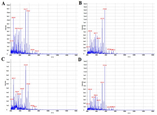 The isolated strains were identified with flight mass spectrometry. (A–D) refers to the identification result of flight mass spectrometry after 12, 16, 20 and 24 h of cultivation.