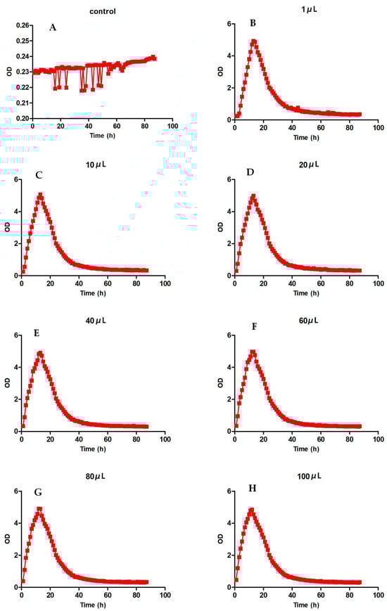 We evaluated the growth of Pseudomonas aeruginosa with different dilutions after 87 h of growth. From Figure 3, we can see that it reached a peak at 12–13 h after cultivation, dropped to a low point around 40 h, and then gradually decreased. However, the peak times of Pseudomonas aeruginosa were different. The bacteria with low dilution took longer to peak than the bacteria with high dilution. However, the peak OD value of the bacteria with low dilution was higher than that of the bacteria with high dilution. The higher the OD value, the more bacteria there were. As shown in Table 3, it can be seen that the OD value obtained by 10 μL of diluted bacterial solution was the highest, and the OD value obtained by 100 μL of diluted bacterial solution was the lowest.