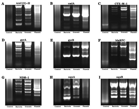 Analysis of drug resistance genes of Pseudomonas aeruginosa isolated from industrial wastewater. (A–I) refer to the nucleic acid electrophoresis images of the resistance gene (AAC (3)—II, cmlA, CTX-M-l, gyrA, gyrB, blaKPC, NDM-1, oqxA and oqxB genes).