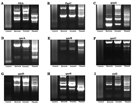 Analysis of drug resistance genes of Pseudomonas aeruginosa isolated from industrial wastewater. (A–I) are the nucleic acid electrophoresis images of the resistance gene (AAC (3)—II, cmlA, CTX-M-l, gyrA, gyrB, blaKPC, NDM-1, oqxA, oqxB, OXA, parC, qepA, qnrA, qnrB, qnrC, qnrD, qnrS and Sul2 genes).