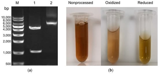 The expression systems in vitro of the E. coli BL21 hosting vector pET-30a::Iro plasmid for the recombinant iron oxidase from A. ferridurans Riv11 was built. The plasmid was extracted and checked with enzyme-digested agarose gel electrophoresis analysis (Figure 1a) and an electrophoretic band corresponding to the length of the target gene was present, indicating the success of the gene ligated into the plasmid. This plasmid was further sequenced between the T7 and T7-terminal sites and confirmed that the sequence construction was completely correct.