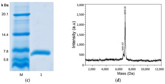 The expression of the iron oxidase in E. coli BL21 was performed at different IPTG concentrations and temperatures, and proteins were all obtained in very high yield at all tested conditions of 0.4–1.0 mM IPTG and 15–37 °C. The six-His-Tag added to the N-termial of the protein greatly accelerated the protein purification process and enabled one-step affinity chromatography. The final protein yield after affinity chromatography was above 4.0%. The purities of the purified proteins were examined by SDS-PAGE, and single bands corresponding to the 7 kDa protein were observed with >95% purity (Figure 1c), which was in line with the deduced molecular mass of the protein. The protein samples were dialyzed against a solution of 10 mM phosphate pH 8.0, 300 mM NaCl and a solution of HCl pH 2.0, 300 mM NaCl. It appeared that this protein is more stable in an acid solution than in a neutral solution. This protein can be stored at 4 °C in a solution of pH 2.0 for one month without appreciable degradation, while in a solution of pH 8.0 for one week, it produces obvious precipitates.