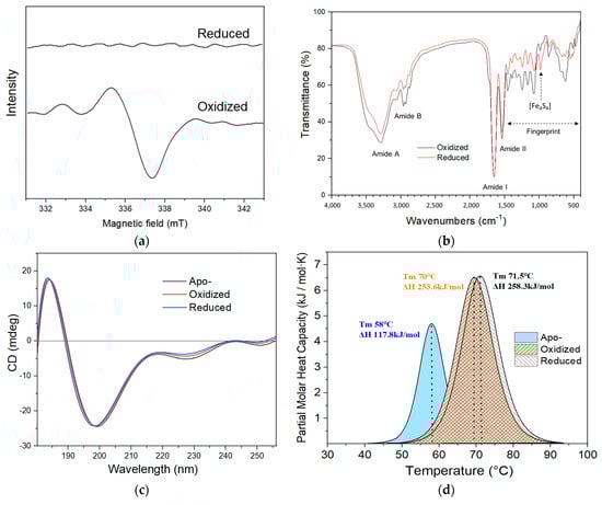 The oxidized and reduced iron oxidase were obtained, both were also brownish and cannot be visually distinguished (Figure 1b). The EPR spectra of the reduced and oxidized iron oxidase are shown in Figure 2a. The protein in its reduced state shows no EPR activity, while in its oxidized state, it exhibits a typical S = 1/2 EPR signal, indicating the presence of the [Fe4S4]3+ cluster. The CD spectra of the oxidized and reduced proteins are shown in Figure 2c, which are very in line with those of the Iro protein from A. ferrooxidans []. However, both of the oxidized and reduced states showed nearly identical spectra, indicating that redox state changes had no effects on the secondary structure of the protein.