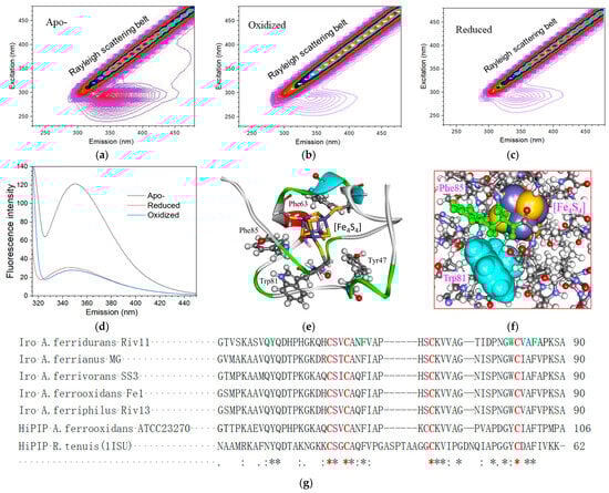 Fluorescence analysis of iron oxidase from A. ferrianus and its bioinformatics insights. (a) Three-dimensional fluorescence spectrum of apo protein of iron oxidase. (b) Three-dimensional fluorescence spectrum of oxidized iron oxidase. (c) Three-dimensional fluorescence spectrum of reduced iron oxidase. (d) Steady-state fluorescence emission spectra of oxidized and reduced iron oxidase and its apo protein at an excitation wavelength of 295 nm. (e) The intrinsic protein fluorescence residues in iron oxidase. (f) The residue environment of tryptophan in iron oxidase. (g) The sequence alignment of mature proteins of iron oxidase and HiPIP from A. ferridurans and other various sources. HiPIP: high redox potential iron sulfur protein; Iro: iron oxidase. All the sequences can be obtained from the NCBI Genebank (https://www.ncbi.nlm.nih.gov (accessed on 7 October 2023)) and their accession codes are as follows: Iro A. ferridurans Riv11:WP_215878501; Iro A. ferrianus MG:WP_239058863; Iro A. ferrivorans SS3:AEM47577; Iro A. ferrooxidans Fe1:CAA40594; Iro A. ferriphilus Riv13:WP_215860796; HiPIP A. ferrooxidans ATCC23270:ACK79288; and HiPIP R. tenuis(1ISU):P33678.Residues conserved in all sequences are marked with an *. Residues not conserved in all sequences but conserved in some sequences are marked with (:) or (.) based on the degree of conservation. The cysteine residues ligating the [Fe4S4] cluster are red. The intrinsic protein fluorescence residues are in green.