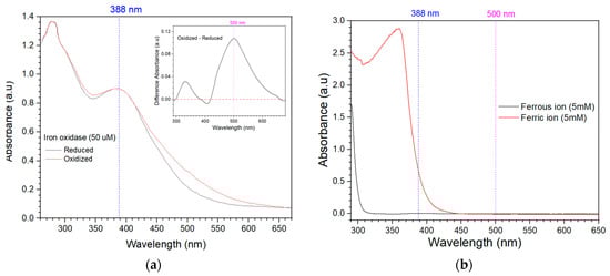 The UV-visible spectra of ferrous and ferric ions at 5 mM are shown in Figure 4b. Ferrous ion shows no spectral absorbance activity when its scanning wavelength is greater than 320 nm. While ferric ion shows strong absorbance when its scanning wavelength is greater than 320 nm, it also shows a quick decrease as the wavelength increases and this absorbance reaches near zero when the wavelength is greater than 445 nm. The measured extinction coefficient of ferric ion at 388 nm is about 0.1322 mM−1cm−1, which is two orders of magnitude lower than that of iron oxidase at 388 nm and even one order of magnitude lower than that of the difference spectrum between oxidized and reduced forms of iron oxidase at 500 nm.