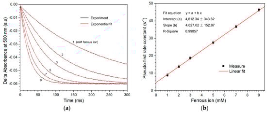 The time courses of various concentrations of Fe2+ oxidized by oxidized iron oxidase all showed an evident exponential decay behavior of pseudo-first-order kinetic with a fit R-square >99%, as shown in Figure 5a. The dependence of k1st upon different concentrations of Fe2+ was highly linear; the obtained second-order rate constant was about 4.6 × 103 M−1s−1 (Figure 5b).