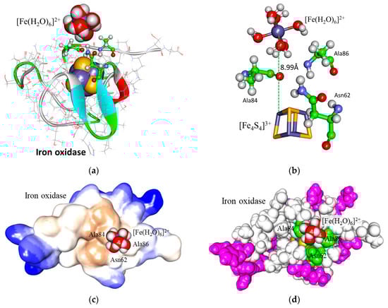 The molecular simulation for the interaction between iron oxidase and ferrous ion in a similar protein physiological condition of water solution of pH 2.0 and 300 mM NaCl was carried out and a most frequent contact configuration of ferrous ion to iron oxidase was obtained and selected as the final interaction model, as shown in Figure 6a. In this configuration, the ferrous ion ([Fe(H2O)6)]2+) approached the protein on a surface consisting of Asn62, Ala84, and Ala86. These residues are directly contacted by [Fe4S4] and constitute the shortest pathway for the cluster to reach a solution. The distance between the Fe atom in the ferrous hexahydrate complex [Fe(H2O)6)]2+ and the nearest Fe atom in [Fe4S4] was 8.99 Å (Figure 6b). The interaction energy between iron oxidase and ferrous ions was analyzed. The electrostatic, van der Waals, and total interaction energies for the interaction were −23, −9 and −31 kJ mol−1, respectively.