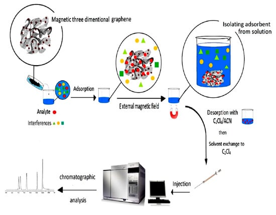 - Mahpishanian, S.; Sereshti, H. Three-dimensional graphene aerogel-supported iron oxide nanoparticles as an efficient adsorbent for magnetic solid phase extraction of organophosphorus pesticide residues in fruit juices followed by gas chromatographic determination. J. Chromatogr. A 2016, 1443, 43–53. [Google Scholar] [CrossRef]