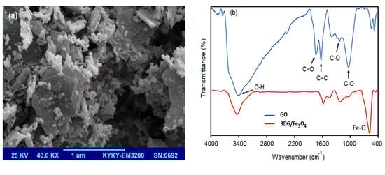 The morphology, chemical composition and structure, and magnetic characteristics of the adsorbent were characterized using various techniques, including SEM, FTIR, VSM, XRD, Raman spectroscopy, BET, and BJH. Figure 2a shows the SEM imaging of 3DG/Fe3SO4, in which the reduced GO nanosheets are arbitrarily assembled into an interconnected porous 3D network structure, and the iron oxide nanoparticles are well spread in all parts of the 3DG assembly, attached to the graphene sheets. Figure 2b illustrates the FT-IR transmittance spectra of GO and 3DG/Fe3SO4. The main characteristic peaks in the GO spectrum that are observed at 3440, 1734, 1622, 1220, and 1034 cm−1 could be ascribed to the stretching vibrations of carbonyl C=O, aromatic C=C, epoxy C–O, and hydroxyl C–O functional groups, respectively. In the 3DG/Fe3O4 infrared spectrum, the intensity of oxygen-containing functional groups mentioned above has considerably decreased. This indicates an effective reduction in GO sheets during the synthesis of 3DG hydrogel. Furthermore, the peak at 574 cm–1 is assigned to the Fe–O stretching vibrations. Therefore, it can be inferred that the 3DG/Fe3O4 hydrogel has been effectively produced through the co-assembly process of graphene sheets and Fe3O4 nanoparticles.