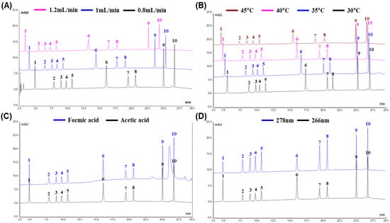 Overlaid chromatogram of 10 flavonoids with different (A) flow rates (0.8, 1.0, and 1.2 mL/min), (B) column temperatures (30, 35, 40, and 45 °C), (C) mobile phase buffers (acetic acid and formic acid), and (D) wavelengths (266 and 278 nm). Plot annotation: 1, Rutin; 2, Narirutin; 3, Naringin; 4, Hesperidin; 5, Neohesperidin; 6, Quercetin; 7, Naringenin; 8, Hesperetin; 9, Nobiletin; 10, Tangeretin.