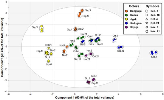 PCA was subsequently applied to outline all the data and find novel patterns in the complex datasets formed from 30 Citrus samples (five Citrus species harvested at six different periods) with eight variables (flavonoids detected in the samples). The two highest-ranking principal components (PCs) of the score plot accounted for 77.0% of the total variance, indicating that the two PCs were sufficient to explain the variability (Figure 2). The percentage of variables for the PCs was 50.6% for the first and 26.4% for the second. In the score plot, the samples were grouped according to similarities in their metabolic properties, and both PC1 and PC2 largely contributed to the separation of Citrus species. In particular, the highest-ranking PC separated Dangyuja and Jigak from the other three species. This result supports previous reports regarding genetic variations occurring within Citrus species based on sequence analysis [,]. Hong et al. (2015) revealed that C. aurantium and C. grandis shared a high similarity rate, forming one monophyletic group []. Nicolosi et al. (2000) also found that C. aurantium and C. grandis were clustered together on a 50% majority rule consensus tree obtained from RAPD and SCAR data []. Our results may reflect the fact that the genotypes involved in the construction of phylogenetic relationships are connected to flavonoid metabolism. Moreover, for each Citrus species, most samples drifted apart from 3 September to 21 November, except for Gamja, where all harvesting periods were clustered together in the middle (Figure 2). Additionally, in Jigak, a clear separation was observed between the earliest harvested sample (on 3 September) and the others on the y-axis. Our PCA results presented various clustering patterns for samples, associated with the harvesting period as well as the Citrus species.
