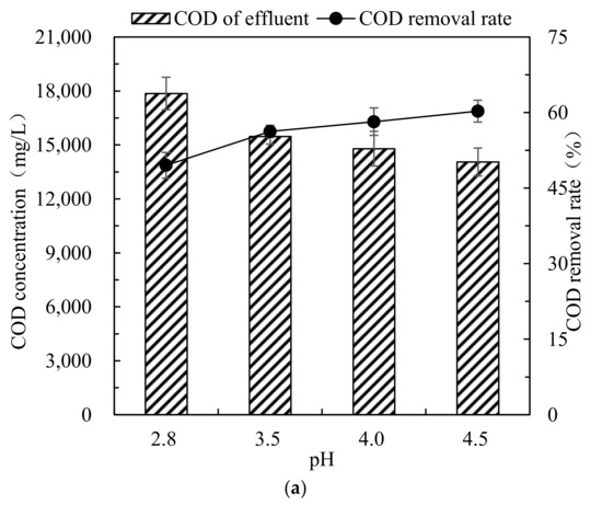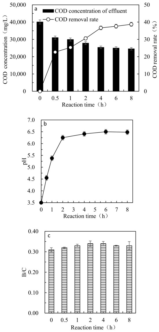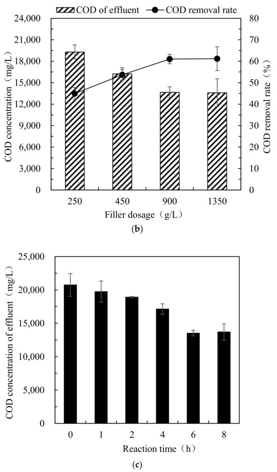 Studies have shown that changes in pH value have little effect on the removal rate of COD (Figure 4a). Therefore, in order to reduce the used amount of alkali, it is more appropriate to adjust the pH of the Fenton effluent to 3.5 in the Fenton-ICME combined process. It can be seen from Figure 4b that when the amount of filler was increased to 900 g/L, the COD concentration of the leachate was decreased to 13,660 mg/L, and the COD removal rate reached 61.0%. Thus, it reveals that in the Fenton-ICME combined process, when the iron–carbon filler dosage is 900 g/L, a stable treatment effect can be guaranteed. From Figure 4c, it can be seen that with the reaction proceeding, the treatment performance became better and better. After 6 h of reaction, the COD removal rate reaches stability. Therefore, the optimal ICME reaction time in the Fenton-ICME combined process is 6 h.