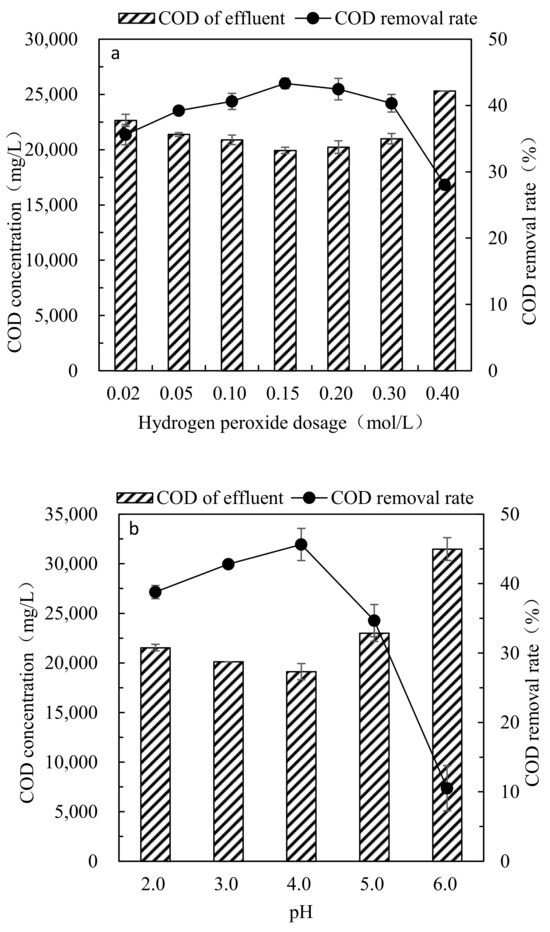 The Fenton oxidation process: H2SO4 and NaOH were used to adjust the pH of the leachate to a suitable value, and then a certain amount of the leachate and solid FeSO4·7H2O was placed into a 250 mL beaker. Stirring was performed until FeSO4·7H2O was completely dissolved. Then, a certain amount of 30% H2O2 solution was added to the solution and agitated at 500 rpm. After 1 h of reaction, the sample was taken, and a certain amount of NaOH solution was added to adjust the pH. The supernatant was taken to determine the COD concentration after settling.