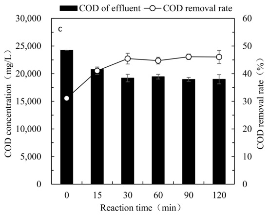 To further investigate the dependence of COD removal on time, as mentioned before, samples were taken during 8 h of study. It was found that the removal was gradually increased till 6 h, after which it saw almost no change (Figure 4c). This suggests that 6 h reaction time is sufficient for COD removal, and further increases of the reaction time will not bring higher removal but only consume more energy. From the analysis of the COD removal rate during the 6 h treatment, it can be seen that the linear correlation coefficient was around 0.97 (Figure 5d). This reveals that the reaction time has a great impact on the COD removal and should be considered in similar studies.