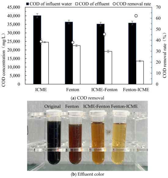 It can be seen from Figure 5b that the original leachate was dark black, turned into brown after the Fenton treatment, turned yellow after the ICME-Fenton treatment, and turned light yellow after the Fenton-ICME treatment. From the apparent results, Fenton-ICME has the best treatment effect.