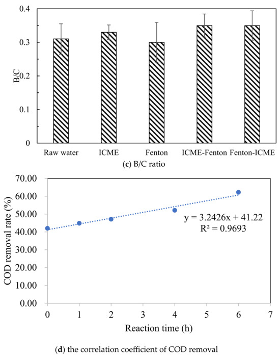 From Figure 5c, it can be observed that the single Fenton oxidation process did not improve the B/C ratio, which was 0.31 and 0.30 before and after the treatment, respectively. Meanwhile, the ICME-Fenton process and the Fenton-ICME process both increased the BOD/COD value of the effluent from 0.31 to 0.35.