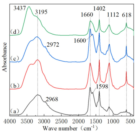 The leachates, before and after being treated with Fenton-ICME, were scanned with FTIR. As shown in Figure 6, a large peak was observed at a wavenumber of about 3195 cm−1 for the original leachate, which was mainly attributed to the stretching vibration of C–H in aromatics. A weak vibration peak was observed at a wavenumber of 2968 cm−1, which was related to the stretching of CH2 and CH3 groups [17], indicating the presence of long-chain aliphatic hydrocarbons in the stock solution. The peak at about 1660 cm−1 is mainly attributed to the stretching vibration of C=C [18], the peak at about 1402 cm−1 is mainly attributed to –COOH [19], the peak at about 1112 cm−1 is mainly attributed to the stretching vibration of C=O [20], and the peak at about 618 cm−1 is mainly attributed to the stretching of N–H and O–N=O [17] and may also be related to Fe–O [21]. This reveals that the main organic compounds in the filtrate are long-chain aliphatic hydrocarbons, aromatic compounds, ketones, and amides. It can be seen that the FTIR spectral analysis results of the original leachate are essentially consistent with the results of GC-MS (as shown in Table 2).