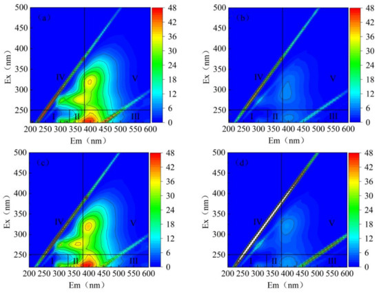 The three-dimensional fluorescence spectra of the original leachate, Fenton-treated leachate, ICME-treated leachate, and Fenton-ICME-treated leachate are given in Figure 7.