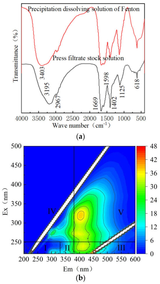 The Fenton precipitation solution was scanned with Fourier transform infrared spectroscopy, and the spectra are shown in Figure 8a. It can be seen that the peak with a wave number of 3403 cm−1 in the dissolved solution of the Fenton precipitation could be attributed to the stretching of O–H. Compared with the original leachate, except for the peak with wave number of 3195 cm−1, which disappeared, the other peaks were not significantly different. It can be considered that the composition of the Fenton precipitation solution and the original leachate is highly similar, and special attention should be paid to pH control in practical engineering applications. Three-dimensional fluorescence scanning was performed on the Fenton precipitation solution, and the spectrum is shown in Figure 8b.