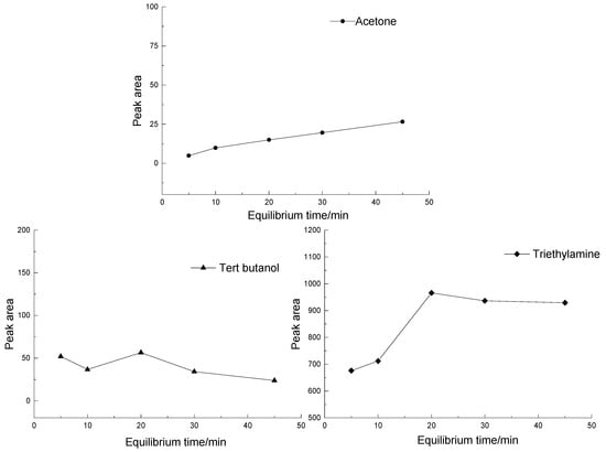 The results indicate that the test results of different equilibrium times meet the system suitability requirements, and there is no significant difference in retention time. With the extension of headspace equilibration time, the peak area of acetone and triethylamine increases progressively, reaching its maximum when the equilibration time reaches 45 min. For tert-butanol, the peak area also shows a slight increase with longer equilibration time. However, the change is not very significant. Under the condition of a 45-min equilibration time, the separation factors for acetone, tert-butanol, and triethylamine are 6.036, 2.326, and 23.145, respectively. The theoretical plate numbers are 11,794, 15,745, and 127,108, while the tailing factors are 0.989, 1.027, and 1.701, respectively. Peak symmetry, separation, and column efficiency are all superior to the results obtained under other conditions, further enhancing product separation.