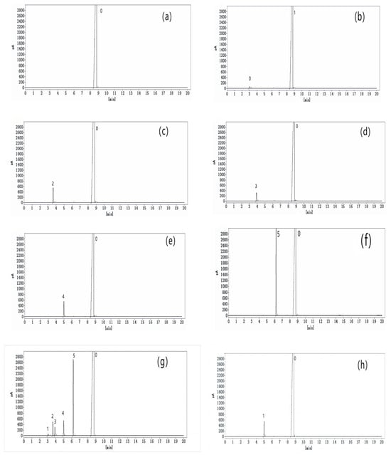 The chromatogram of system suitability. (a) Blank solvent; (b–f) localization solutions of five residual solvents (0—dimethyl sulfoxide; 1—methanol; 2—acetone; 3—tert-butanol; 4—ethyl acetate; 5—triethylamine); (g) reference solution; (h) sample solution.