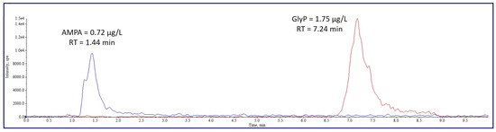 Chromatogram of the quantifier ions of AMPA and GlyP in a urine sample from an agricultural worker (0.72 µg/L of AMPA and 1.75 µg/L of GlyP).