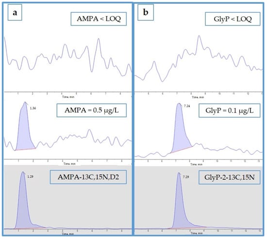 In Figure 2, an example of the quantifier ion chromatograms of AMPA (a) and GlyP (b) and their internal standards in blank urine and in urine with the analytes at the LOQ are shown; although the retention time of AMPA is still quite short (2 min), the chromatographic signals for both AMPA and GlyP are clearly distinguishable from the noise.