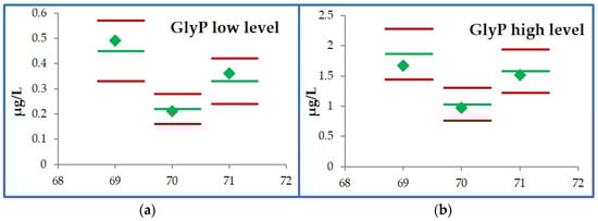 The external verification was performed only for GlyP, as it is not available for AMPA. Participation in the G-EQUAS rounds 69, 70, and 71 was evaluated as satisfactory for both the low and high levels. In round 69, we reported concentrations of 0.49 and 1.67 µg/L vs. 0.45 (0.33–0.57) and 1.86 (1.44–2.28) µg/L. In round 70, we reported concentrations of 0.21 and 0.97 µg/L vs. 0.22 (0.16–0.28) and 1.03 (0.76–1.30) µg/L. In round 71, we reported concentrations of 0.36 and 1.51 µg/L vs. 0.33 (0.24–0.42) and 1.58 (1.22–1.94) µg/L (see Figure 3). Also, considering the G-EQUAS samples of three previous rounds, the accuracies ranged from 90 to 110%.