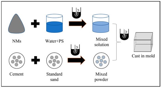 The mixing process of the specimens is depicted in Figure 1. In detail, the NMs were firstly mixed with the water and polycarboxylate superplasticizer (PS) at the speed of 1500 rpm to obtain the mixed solution, and the cement and standard sand were mixed at the speed of 300 rpm for 2 min; then, the mixed solution was put into the raw materials. The mixture was further mixed at the speed of 500 rpm for 5 min. Finally, the fresh mixture was poured into the mold, and the size of the mold was 50 mm × 50 mm × 50 mm. Moreover, it needs to be emphasized that the mixing method may cause potential nonuniformity in the mechanical and seepage properties of cement-based materials. This nonuniformity issue may also exist for the application of adding other materials into the specimens, while a small amount of NMs may not induce such significant results [,].