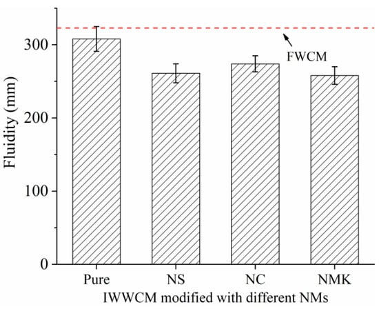The fluidity of the mixtures incorporated with different NMs is shown in Figure 2; it can be seen that the addition of NMs induced a remarkable adverse effect on the workability of the freshly prepared mixtures, in that the fluidity of the specimens showed a significant decreasing trend with the addition of 1.75% NM content. This fluidity reduction phenomenon was considered to be connected with the fairly small fineness of NMs. The small fineness of the particle would lead to a high water demand for the specimens including NMs, the internal water would be consumed at early stage, and this is a common phenomenon of the CBMs incorporated with different kinds of NMs. Further, it was also found that the fluidity of IWWCM was lower than that of FWCM. Under this circumstance, the use of PS was significant in this work to control the fluidity of the nano-modified specimens to produce accurate test results.