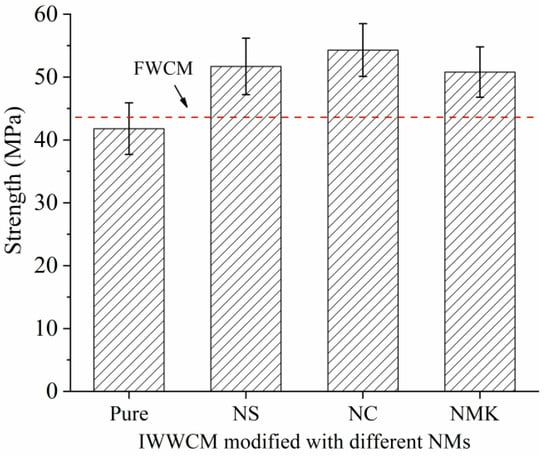The 28-day strengths of the IWW-mixed specimens were tested and shown in Figure 3. It can be noticed that the use of IWW as mixed water to fully replace FW in the cement mortar was harmful to the compressive strengths. To be specific, the FW-mixed specimen had a 28-day strength of 44.6 MPa, which was 7% higher than that of IWWCM with the value of 41.8 MPa. The strength test results indicated the harmful effect of excessive SO42− inside the mixed water on the mechanical performance of the cement-based materials. In addition, it was also found that the use of NMs was helpful for the strength improvement of IWWCM. The compressive strengths of the nano-modified specimens were all higher than 50 MPa, showing a more than 10% increase compared to the FWCM specimen. This proved the advantageous effect of NMs on enlarging the mechanical strength of the IWW-mixed cement mortar. The compressive strengths of the IWWCM incorporating NS, NC, and NMK were 51.7 MPa, 54.3 Mpa, and 50.8 MPa, respectively. Compared with the pure IWWCM, the compressive strengths of the specimens were increased by 23.7%, 29.9%, and 21.5%, respectively. In addition, compared with the FWCM specimens without IWW, the strengths of the IWWCM specimens doped with NMs were also significantly improved.