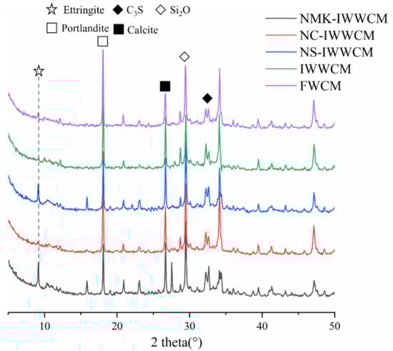 XRD analysis is a typical test method for the identification of the phase composition inside cement-based materials, and this method was used in this work to analyze the generation of hydration products in the specimens incorporating different kinds of NMs. As shown in Figure 5, it can be found that the main phase composition inside the specimens was consistent, and this indicated that the inclusion of IWW or NMs may not induce additional products at this curing environment. However, it needs to be emphasized that the XRD analysis was semi-quantitatively used in this work to reflect the hydration situation of the specimens with different mixed situation; further analysis is crucial for further verification of the effect of the incorporation of nanomaterials.