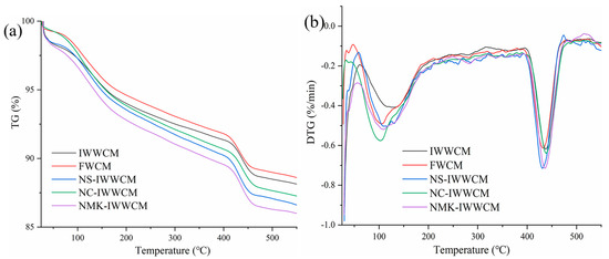 TG and DTG analysis results of the IWWCM specimens with different NMs (a) TG and (b) DTG.