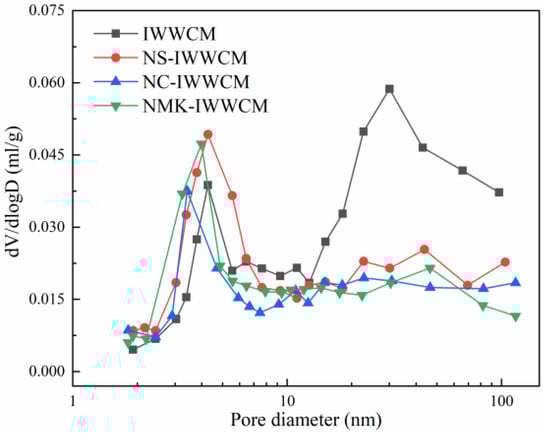 In this work, the micropore structure of the IWWCM was measured by the BET test, and the results are shown in Figure 7. For cement-based materials, the distribution of micropores within the size of 100 nm is considered to be related to the hydration reaction reactivity of the specimen and can reflect the densification of the nanoscale microstructure of the specimens. It can be seen from Figure 7 that the use of NMs could effectively modify the distribution of the micropore structure inside the IWWCM specimens such that the pore distribution curves of the nano-modified specimens were much lower than that of pure IWWCM. Considering that the distribution of micropores smaller than 100 nm is connected with the hydration degree of the specimen, the micropore structure test result could also verify the improved hydration reaction of the IWWCM modified with NMs. Moreover, two high peaks were found in the micropore distribution curve of the IWWCM specimen, the highest peak appeared at the pore diameter around 42 nm, and this was the largest pore diameter for the high peaks shown in all the curves [,,,]. For the specimens modified with NMs, the highest peaks mainly appeared within 10 nm, and this test result also showed the beneficial effect of NMs on the hydration reaction activity of the IWWCM specimens. The test result also proved the beneficial effect of NMs on the micropore structure of the IWWCM specimens.