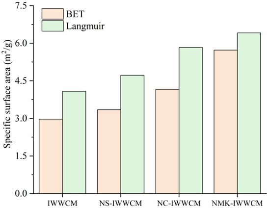 The specific surface area (SSA) values of the specimens were measured by Nitrogen adsorption analysis as shown in Figure 8, and the SSA values were tested by the BET and Langmuir methods, respectively. As shown in Figure 8, the use of NMs could lead to an increase in the SSA values of the internal microstructure of cement mortar. To be specific, in terms of BET-SSA, the values of the IWWCM, NS-IWWCM, NC-IWWCM, and NMK-IWWCM specimens were 2.97 m2/g, 3.35 m2/g, 4.16 m2/g, and 5.72 m2/g, respectively. The SSA values of Langmuir showed the same development rule. The SSA values of Langmuir for IWWCM, NS-IWWCM, NC-IWWCM, and NMK-IWWCM were 4.08 m2/g, 4.72 m2/g, 5.83 m2/g, and 6.41 m2/g, respectively. It was found that the SSA values of the IWWCM doped with NMs increased significantly compared with that of the specimen with no NMs. This SSA-increasing phenomenon indicated the specific effect of NMs on changing the internal microstructure of IWWCM. It should be clarified that the increase in the SSA showed that the complexity of the internal microstructure for cement mortar was improved, and this was beneficial for the binding of excessive SO42− inside the specimen, as the complicated microstructure could adsorb the ions inside the specimen. Moreover, previous sections verified the effect of NMs on improving the hydration reaction of cement mortar, which would also improve the ion adsorption efficiency. Based on the discussion above, it can be summarized that the addition of NMs could both improve the hydration reaction and the micropore structure of cement-based materials; considering the hydration effect inside the specimen, NMs are promising for the performance improvement of the cement-based materials mixed with IWW collected from industrial factories.