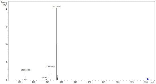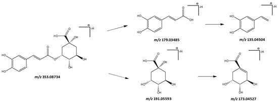 In the negative ion mode, compounds 28 (retention time (tR) = 3.37 min), 46 (tR = 5.59 min), and 54 (tR = 5.83 min) displayed deprotonated ions [M − H]− at m/z 353.08734, m/z 353.08719, and 353.08710, and [2M − H]− at m/z 707.18230, m/z 707.18161, and m/z 707.18126, respectively. Compounds 28, 46, and 54 were identified as being isomeric caffeoylquinic acid, as they shared the same molecular formula of C25H24O12 using DataAnalysis Software (version 4.4, Bruker Daltonics, Bremen, Germany) within 5 ppm. The MS spectra of these compounds were highly similar to each other. The MS/MS spectrum of compound 28 showed the characteristic fragment ions produced were at m/z 191.05593, m/z 179.03485, m/z 173.04527, and m/z 135.04504, which correspond to [M − H-C9H6O3]−, [M − H-C7H10O5]−, [M − H-C9H6O3-H2O]−, and [M − H-C7H10O5-CO2]−, respectively. Fragment ions m/z 191.05593 and m/z 173.04527 corresponded to successive losses of the caffeoyl group and H2O. The elimination of one quinic acid group from the precursor resulted in the production of the fragment ion [M(caffeic acid) − H]− m/z 179.03485, and a molecule of CO2 was subsequently lost to produce a fragment ion at m/z 135.04504. Hence, compound 28 was tentatively identified as neochlorogenic acid. Its MS/MS mass spectrum is shown in Figure 4, and the proposed fragmentation pathways of neochlorogenic acid are shown in Figure 5. Compound 46 was identified as chlorogenic acid, and compound 54 was tentatively identified as cryptochlorogenic acid, respectively. Caffeoylquinic acids are esters of caffeic acid with quinic acid, and their characteristically theoretical fragment ions were found at m/z 191.05611 [M(quinic acid) − H]−, m/z 179.03498 [M(caffeic acid) − H]−, m/z 173.04555 [M(quinic acid) − H-H2O]−, and m/z 135.04515 [M(caffeic acid) − H-CO2]−, respectively.