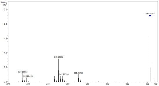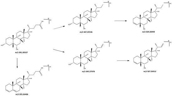 In the positive ion mode, compound 233 was found at 20.42 min and showed the protonated ion [M + H]+ at m/z 409.29450. The molecular formula was predicted to be C24H40O5 using DataAnalysis Software (version 4.4, Bruker Daltonics, Bremen, Germany) within 5 ppm. In its MS/MS spectrum, the characteristic fragmentation ions at m/z 373.27293, m/z 355.26235, and m/z 337.25178 were observed, representing [M + H-2H2O]+, [M + H-3H2O]+, and [M + H-4H2O]+. Hence, compound 233 was tentatively characterized as hyocholic acid. In the negative ion mode, compound 267 was found at 26.25 min and showed the protonated ion [M − H]− at m/z 391.28527. The molecular formula was predicted to be C24H40O4 using DataAnalysis Software (version 4.4, Bruker Daltonics, Bremen, Germany) within 5 ppm. In its MS/MS spectrum, the characteristic fragmentation ions at m/z 355.26406, m/z 347.29536, m/z 345.27978, m/z 329.28494, and m/z 327.26912 were observed, representing [M − H-2H2O]−, [M − H-CO2]−, [M − H-H2CO2]−, [M − H-CO2-H2O]−, and [M − H-H2O-H2CO2]−, respectively. Therefore, compound 267 was unambiguously identified as hyodeoxycholic acid. Its MS/MS mass spectrum is shown in Figure 8, and the proposed fragmentation pathways of hyodeoxycholic acid are shown in Figure 9.