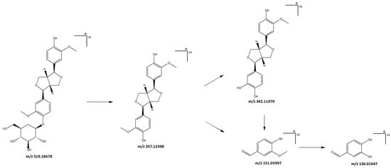 In the negative ion mode, the precursor ion [M + COOH]− of compound 47 was at m/z 417.13993 observed at 5.59 min and the molecular formula was predicted to be C17H24O9 using DataAnalysis Software (version 4.4, Bruker Daltonics, Bremen, Germany) within 5 ppm. The characteristic fragment ion found in the MS/MS spectrum was at m/z 209.08173, corresponding to fragment ion [M − H-Glc], thus, the compound was chemically defined as syringin. The precursor ion [M − H]− of the compound 133 was observed at m/z 519.18678 at 8.94 min and the molecular formula was predicted to be C26H32O11 using DataAnalysis Software (version 4.4, Bruker Daltonics, Bremen, Germany) within 5 ppm. In the MS/MS spectrum, the characteristic fragment ions were at m/z 357.13398, m/z 342.11070, m/z 151.03997, and m/z 136.01647, corresponding to fragment ions [M − H-Glc]−, [M − H-Glc-CH3]−, [M − H-Glc-C12H14O3]−, and [M − H-Glc-CH3-C12H14O3]−, respectively. Hence, compound 133 was tentatively characterized as pinoresinol-4-O-glucoside. Its MS/MS mass spectrum is shown in Figure 10, and the proposed fragmentation pathways of pinoresinol-4-O-glucoside are shown in Figure 11.
