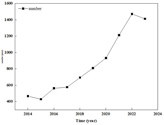 Biochar has been widely used in pollutant treatment in CWs due to its large specific surface area, high porosity, and strong adsorption performance, and its porous property has a high ability to intercept ammonia nitrogen [4]. It also has a good removal effect on heavy metal ions (such as Cd2+, Cr2+, and Pb2+) [5]. Due to its high specific surface area and high porous structure, granular biochar has been found to have a high adsorption capacity for micropollutants compared with gravel and other substrates [6]. Traditional CW nitrogen removal is generally through nitrification and denitrification. Denitrification generally faces the problem of insufficient carbon sources. Biochar can provide a carbon source to promote its reaction, and biochar has a strong adsorption capacity to absorb NH4+-N [7]. Biological nitrification and denitrification are the main ways of nitrogen removal and are largely dependent on environmental factors. Nitrification is the conversion of NH4+-N into NO3−-N, which is strictly dependent on the dissolved oxygen (DO) concentration. Denitrification is a heterotrophic process in which microorganisms convert NO3−-N into nitrogen or nitrous oxide, which is considered to be an important process for nitrogen removal in CWs and is dependent on carbon sources [8]. Biochar can also increase the denitrification capacity of microorganisms by providing electrons and facilitating electron transfer [9]. The presence of biochar in a CW-coupled electrochemical system can reduce the consumption of external organic compounds and enhance the denitrification process. In addition, biochar can be modified by Fe3+ produced by an anode [10]. Biochar can also promote the growth of plants in CWs [11]. For example, biochar provides a large area for microbes to attach and form biofilms, which enhances the removal of biological contaminants. Biochar can absorb pollutants (nitrogen and phosphorus) and then slowly release them and other chemicals for plant growth [12]. Figure 1 shows the trend in the number of papers published on constructed wetlands in the last ten years. Biochar can also sorb non-biodegradable and toxic organic contaminants present in wastewater and contribute to an improved treatment efficiency and lower toxicity of the wastewater matrix to the microbial community.