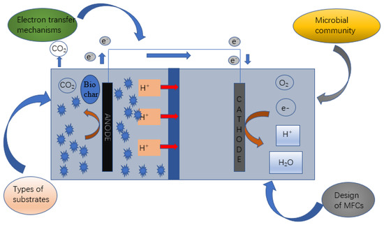 - Prathiba, S.; Kumar, P.S.; Vo, D.-V.N. Recent advancements in microbial fuel cells: A review on its electron transfer mechanisms, microbial community, types of substrates and design for bio-electrochemical treatment. Chemosphere 2022, 286, 131856. [Google Scholar] [CrossRef] [PubMed]
